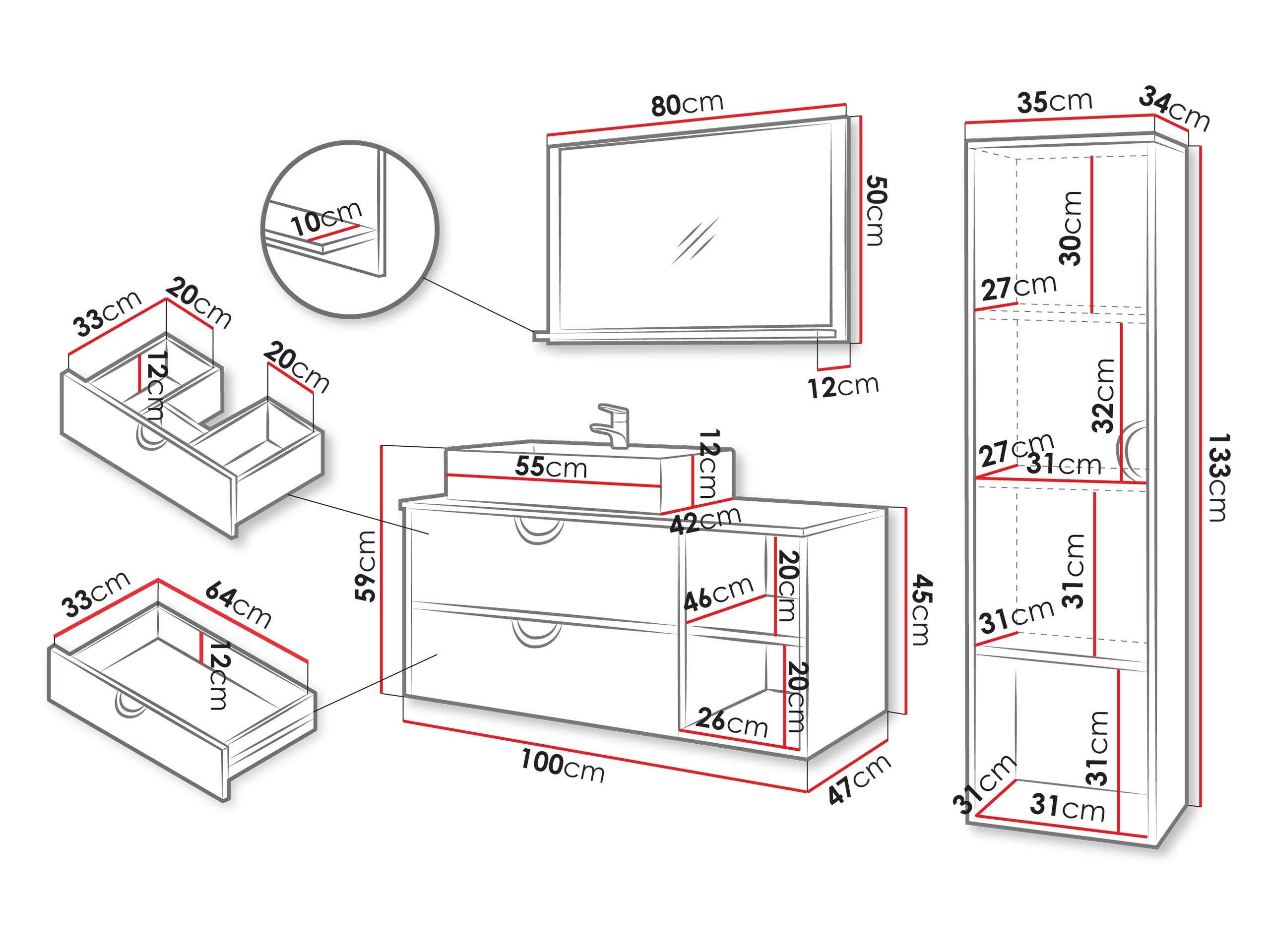 - Medidas del mueble del lavabo: 45 x 100 x 47 cm