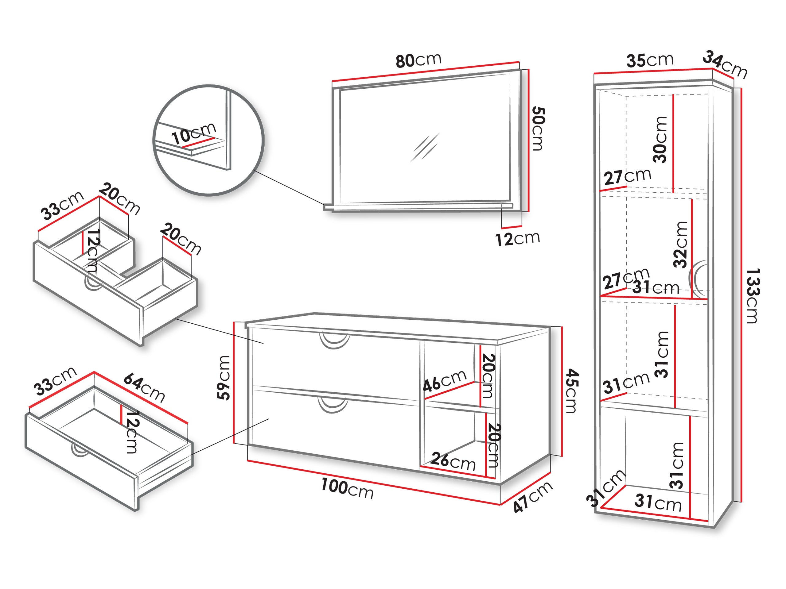 - Dimensiones del armario colgante: 133 x 35 x 34 cm