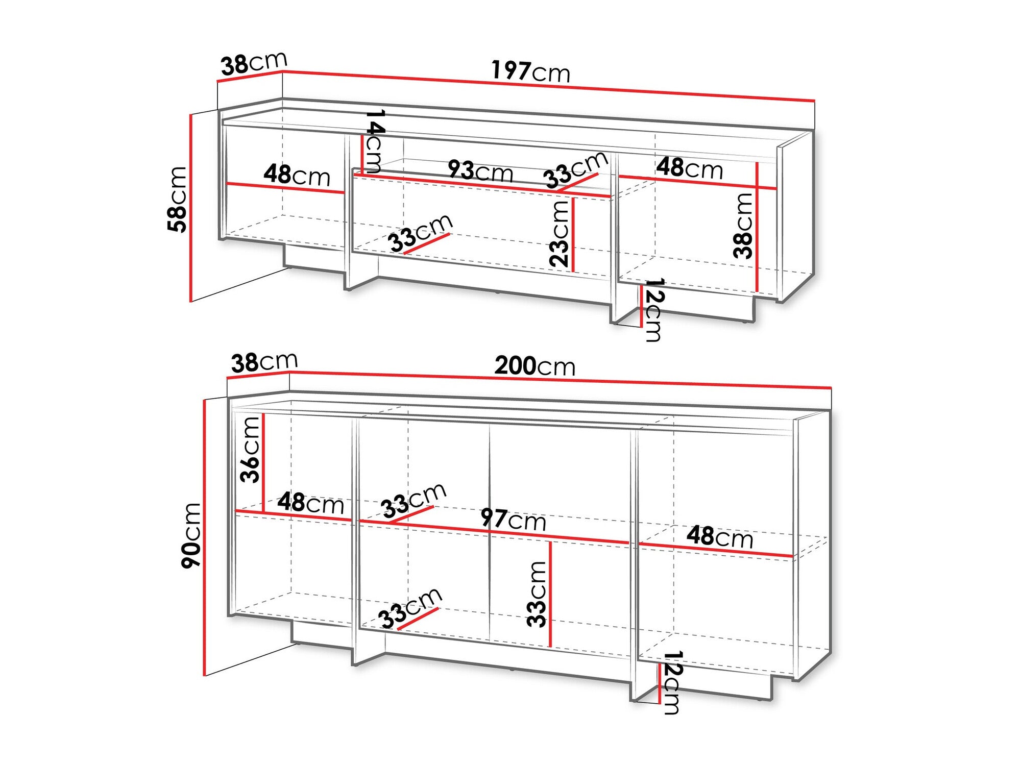 - TV dimensiones de la mesa: 58 x 197 x 38 cm
