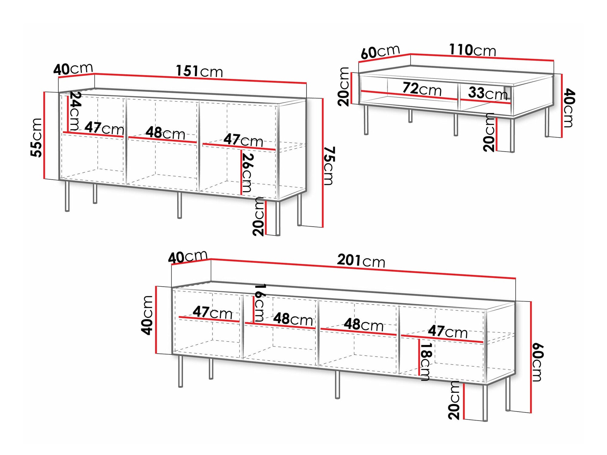 - TV dimensiones de la mesa: 60 x 201 x 40 cm