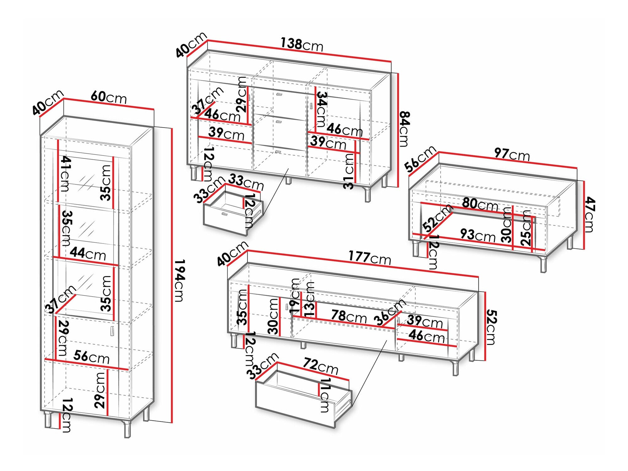 - TV dimensiones de la mesa: 52 x 177 x 40 cm
