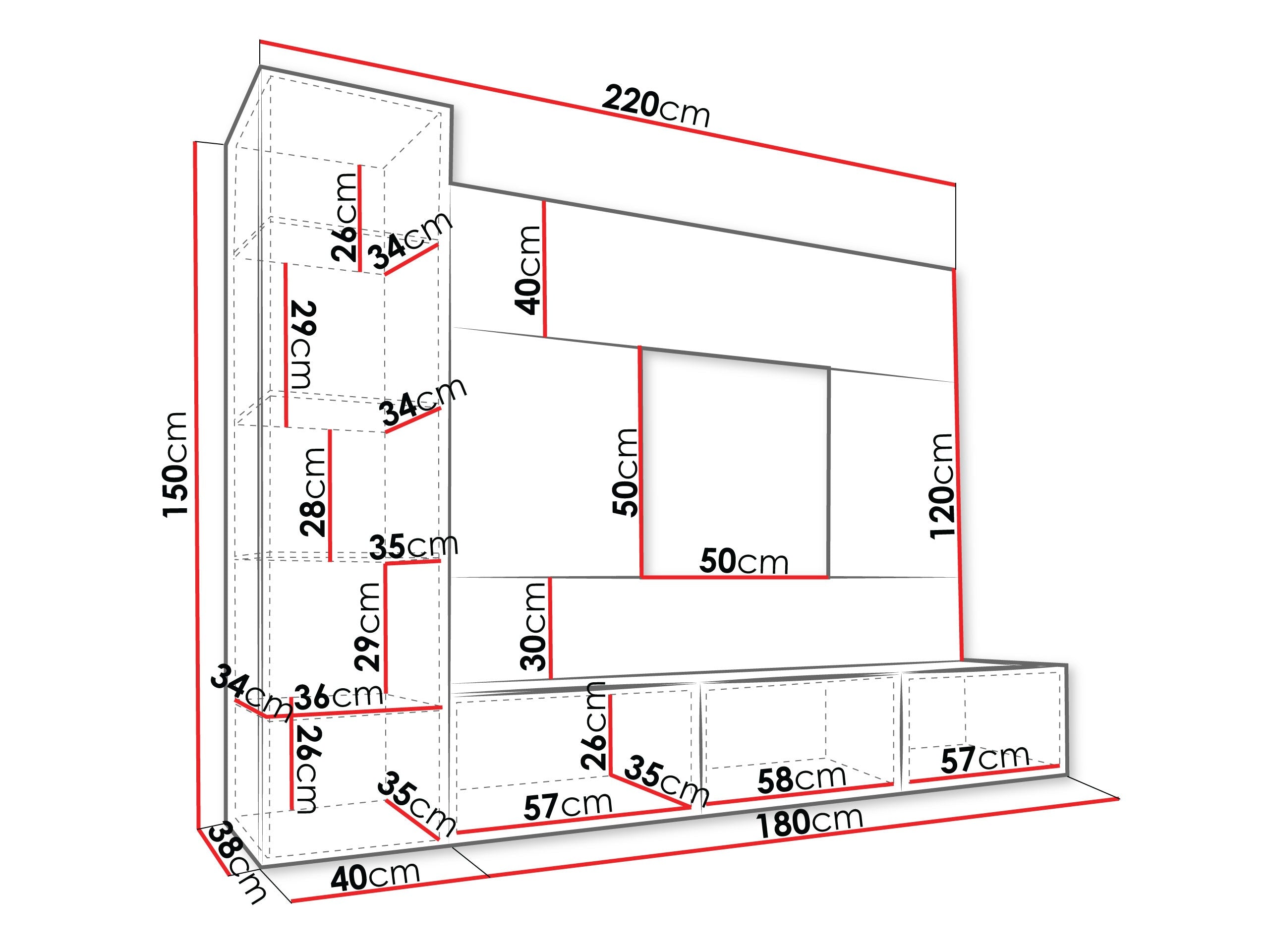 - TV dimensiones de la mesa: 150 x 180 x 38 cm