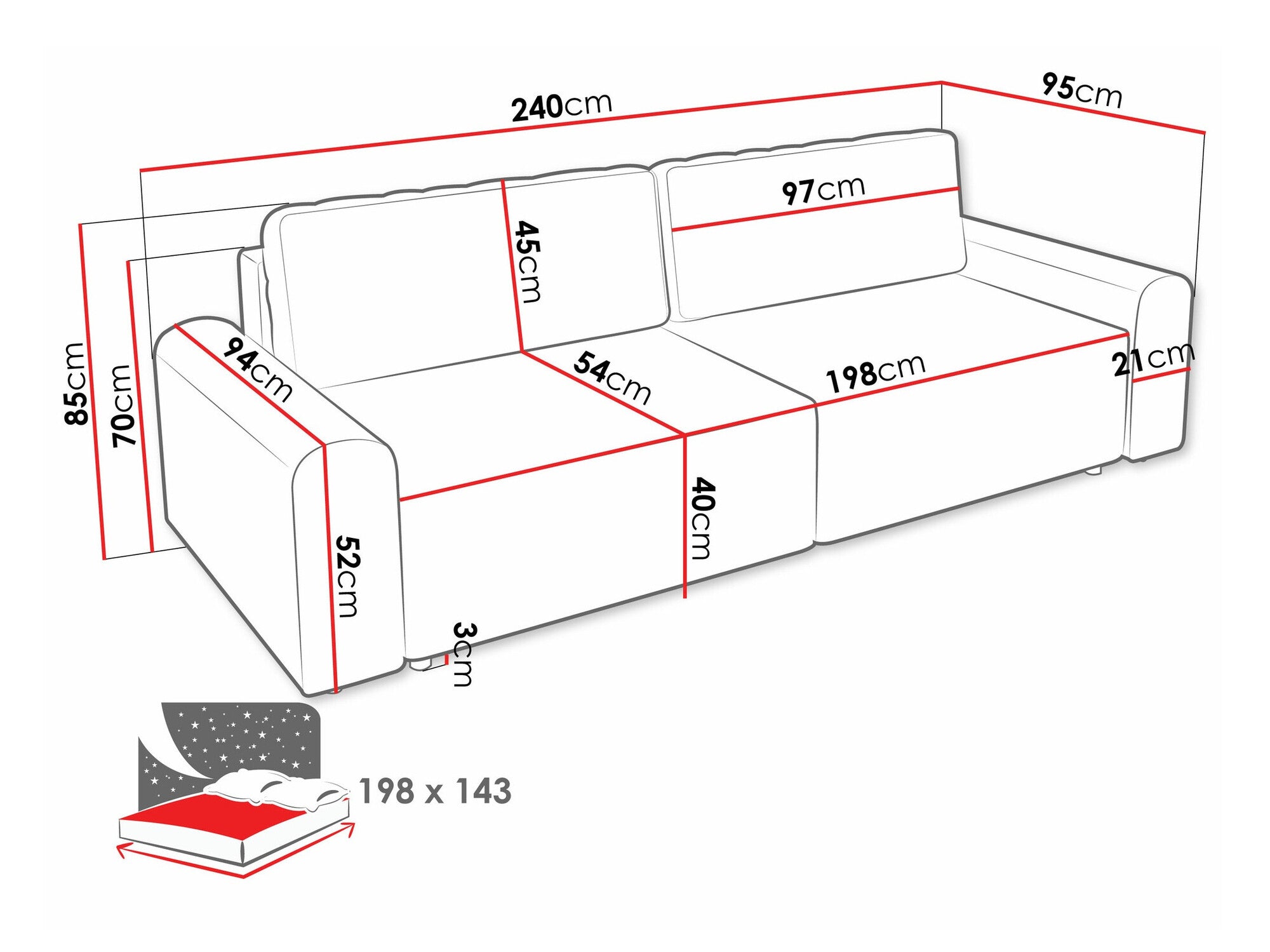 - Ancho de la zona de descanso: 143 cm