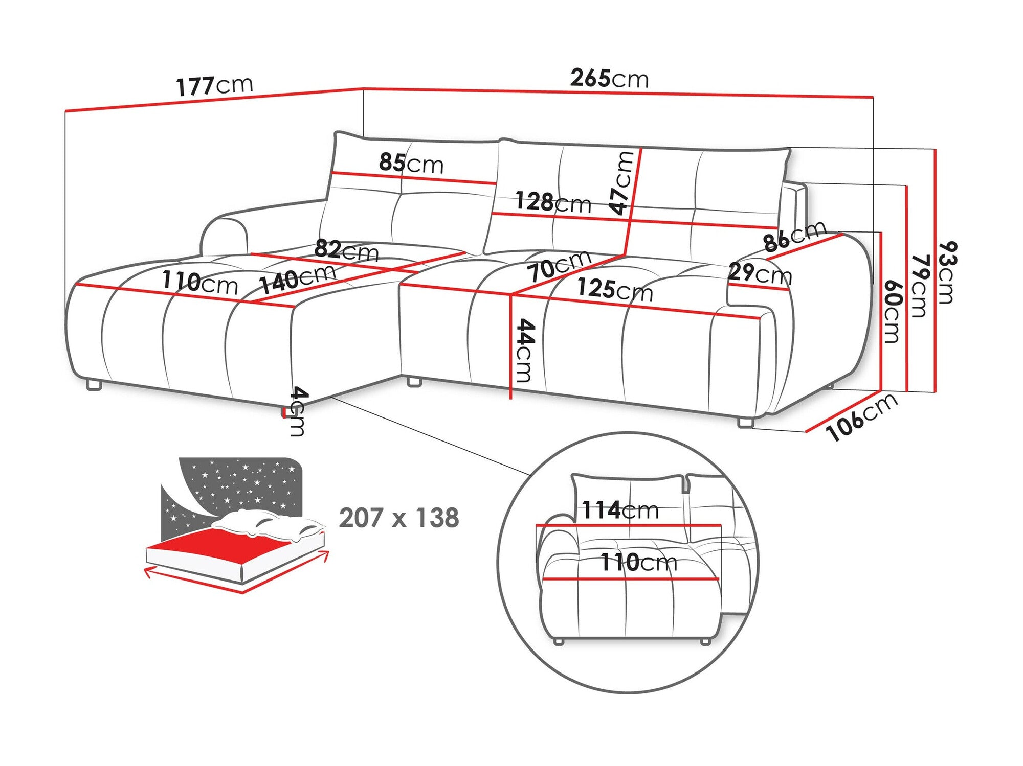 • Longitud del área de descanso: 207 cm