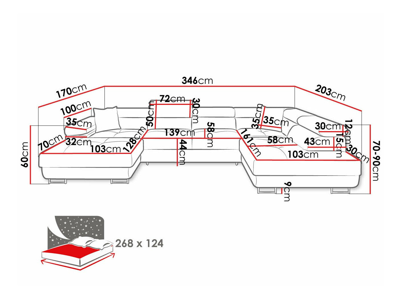 - Longitud del área de descanso: 268 cm